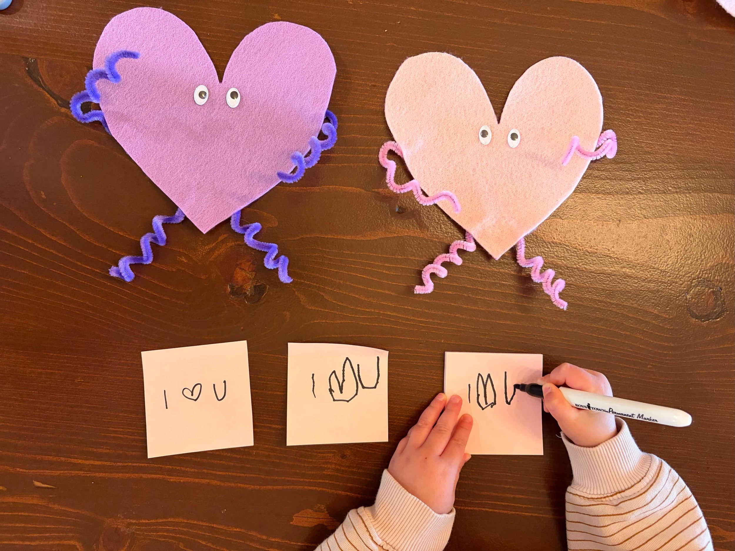 For extra sweetness, we made a tiny sign and taped it into the hands so it looked like the heart was holding it. My daughter wrote “I 🤍 U” in her best almost-four-year-old handwriting — I wrote an example first and she copied it.